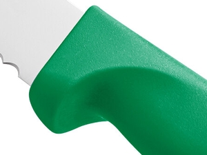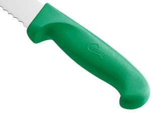 This knife's serrated edge is perfect for slicing tomatoes, sausage, and bread, making it ideal for use in any bakery, sandwich shop, cafe, or restaurant. With a simple sawing action, you can effortlessly create your most popular sandwiches and side dishes without having to worry about flattening or crushing the product. Part of a convenient color-code HACCP line, this knife has a green colored handle that allows it to stand out and makes it great for creating a color-coded system in your kitchen to prevent cross-contamination.