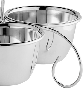 Featuring (3) 10 oz. stainless steel bowls, this durable caddy allows you to serve customers with a variety of condiments right on their table. Plus, the compact design conserves tabletop space, leaving plenty of room for other items.