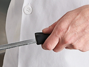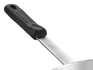 This pan features a sturdy handle that's riveted on, ensuring a very rigid connection between handle and vessel, while guaranteeing longevity even in a commercial kitchen.