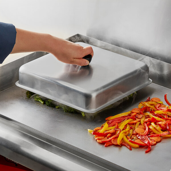 It's perfect for covering food when grilling or cooking on the stovetop. Plus, this 10" basting cover promotes uniform heat distribution within the food for even and tender results. The square shape utilizes space more efficiently on griddles and optimizes limited storage space when not in use.