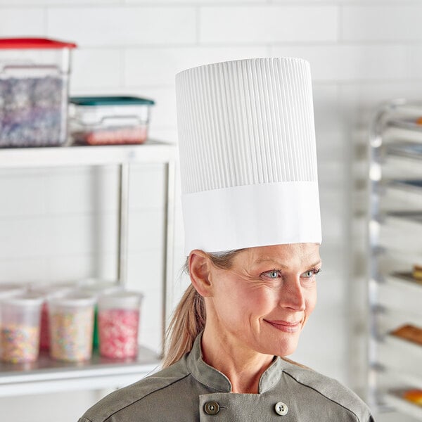 The crisp white color adds a touch of elegance to any culinary setting, making the hats ideal for upscale restaurants, catering events, and culinary schools. Economical and practical, these disposable chef hats are a must-have accessory for any professional kitchen.