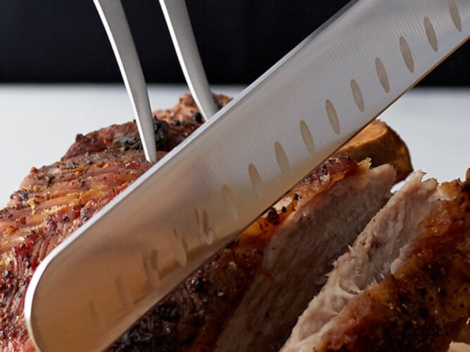 This knife's granton edge features grooves that fill with fat and juices when cutting through meats, allowing more contact between the food and the blade.