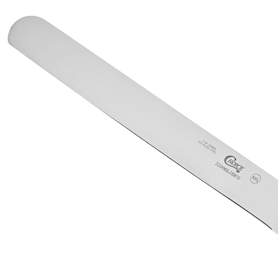 While this knife's straight edge is perfect for slicing roast beef or carving a turkey, its 10" long blade allows you to easily cut through large pieces of meat in one stroke. Long-lasting, light, and affordable, this Choice knife is ideal for use in any high-volume commercial kitchen, as well as culinary schools and cafeterias.