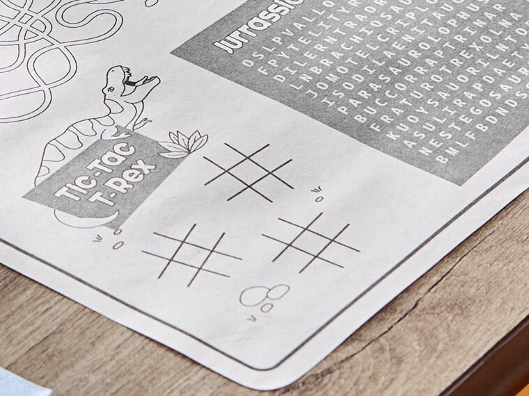 Featuring fun illustrations and visually-appealing, dinosaur designs, the placemat contains various games to keep your younger guests occupied.