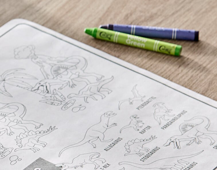 Keep children entertained while waiting for their food to arrive by placing this fun children's Choice dinosaur interactive placemat with 3 pack kids' restaurant crayons at their table settings. When your young guests have finished coloring on the front, they can easily flip it over to do the puzzles on the back. Once the meal arrives, the placemat serves its primary purpose of preventing spills and other food from ruining your tabletops, while the crayons can easily be placed back in their pouch.