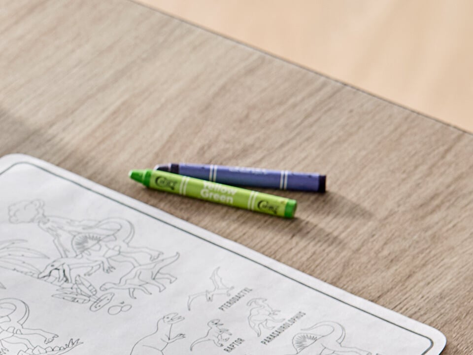 Keep children entertained while waiting for their food to arrive by placing this fun children's Choice dinosaur interactive placemat with 3 pack triangular kids' restaurant crayons at their table settings. When your young guests have finished coloring on the front, they can easily flip it over to do the puzzles on the back. Once the meal arrives, the placemat serves its primary purpose of preventing spills and other food from ruining your tabletops, while the crayons can easily be placed back in their box.