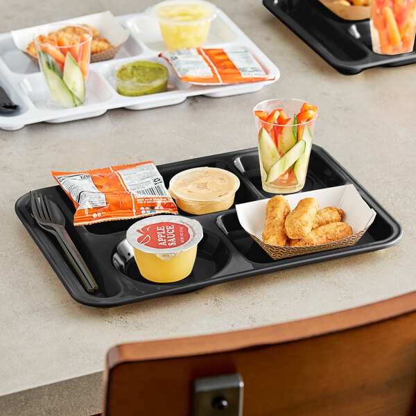 rovide a long-term serving solution for any cafeteria environment with the Choice left handed heavy-duty black 6 compartment tray. Made from tough, durable melamine, this tray resists cracks, breaks, scratches, and even chips, resulting in fewer replacements down the line. Entirely BPA-free, the high-performance material will keep its look over time as it won't corrode from acidic materials and guards against staining.