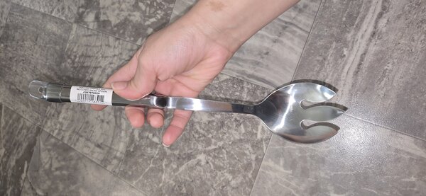 The Choice 11 3/4" Hollow Stainless Steel Handle Notched Salad Serving Spoon is a nice item. The steel handle is strong and doesn't give in the slightest. The prongs at the head of the spoon are useful for certain types of salad items.