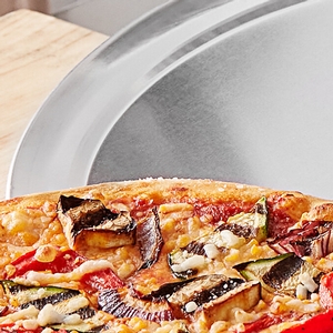 From oven to table, the Choice wide rim pizza pan offers a lightweight, easy-to-carry baking and serving alternative for pizzas or various side dishes. Whether baking in a conveyor or deck oven, you'll find that the overall utility of the pan is optimal for more than just pizza, as it is equally suitable for oven-to-table appetizers like nachos and breadsticks or other entrees like pub sandwiches.