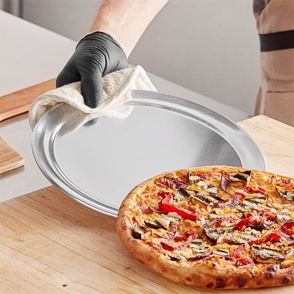 The wide rim design holds the pizza in place, which makes it perfect for fast-paced environments, ensuring the product reaches your guests and not the floor. Plus, it's excellent for conducting heat, which cooks pizzas evenly and quickly. This cost-efficient metal tray pairs with paper food wraps (sold separately) that vary the options of display when used for serving.