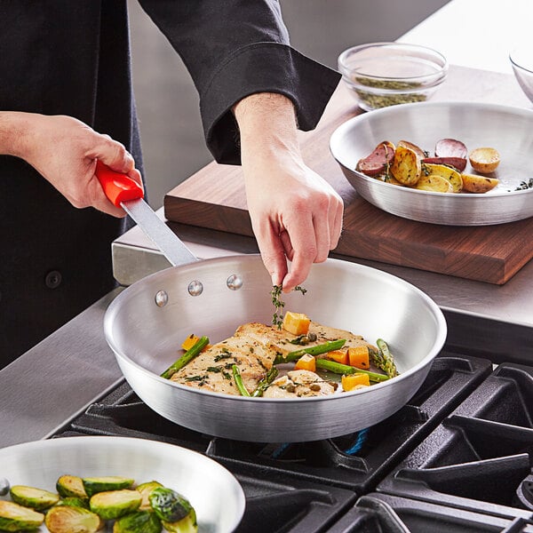 Ideal for making low acidic foods such as mushrooms, broccoli, and cauliflower, this item features gently sloped sides that are perfect for turning, flipping, and removing delicious vegetable medleys from your pan. Its aluminum construction is also built for dependable use yet provides your kitchen with a lightweight, economical option that won't break the budget. Its red silicone handle even offers a comfortable grip that's heat-resistant up to 450 degrees Fahrenheit!