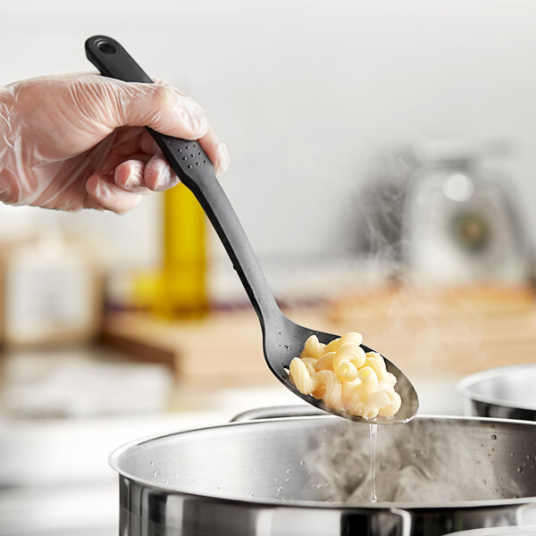 This slotted spoon features a durable nylon construction that is heat-resistant up to 410 degrees Fahrenheit, making it ideal for use in a wide variety of settings. From busy caterers to experienced restaurant chefs, this item is an essential tool for any kitchen.
