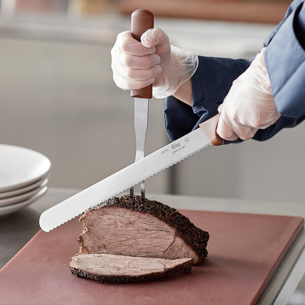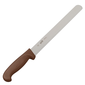 This knife's serrated edge is perfect for slicing tomatoes, sausage, and bread, making it ideal for use in any bakery, sandwich shop, cafe, or restaurant. With a simple sawing action, you can effortlessly create your most popular sandwiches and side dishes without having to worry about flattening or crushing the product. Part of a convenient color-code HACCP line, this knife has a brown colored handle that allows it to stand out and makes it great for creating a color-coded system in your kitchen to prevent cross-contamination.