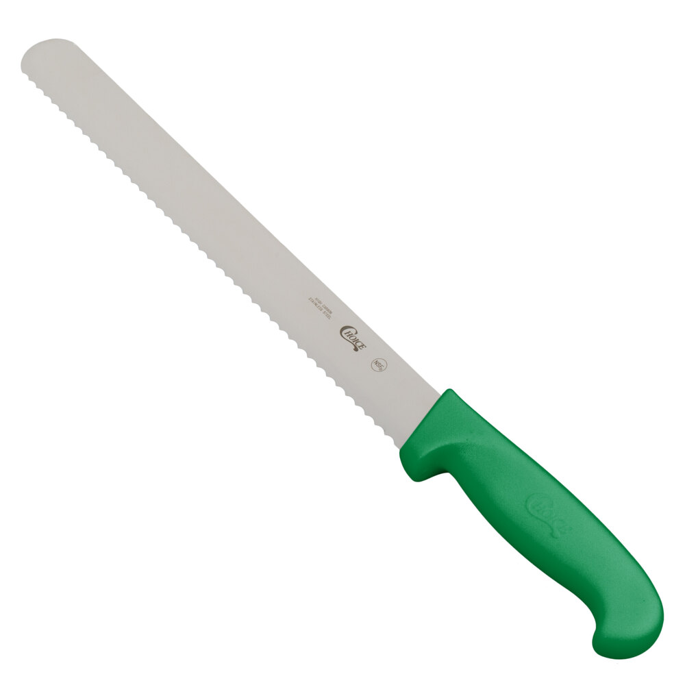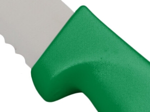 This knife's serrated edge is perfect for slicing tomatoes, sausage, and bread, making it ideal for use in any bakery, sandwich shop, cafe, or restaurant. With a simple sawing action, you can effortlessly create your most popular sandwiches and side dishes without having to worry about flattening or crushing the product. Part of a convenient color-code HACCP line, this knife has a green colored handle that allows it to stand out and makes it great for creating a color-coded system in your kitchen to prevent cross-contamination.