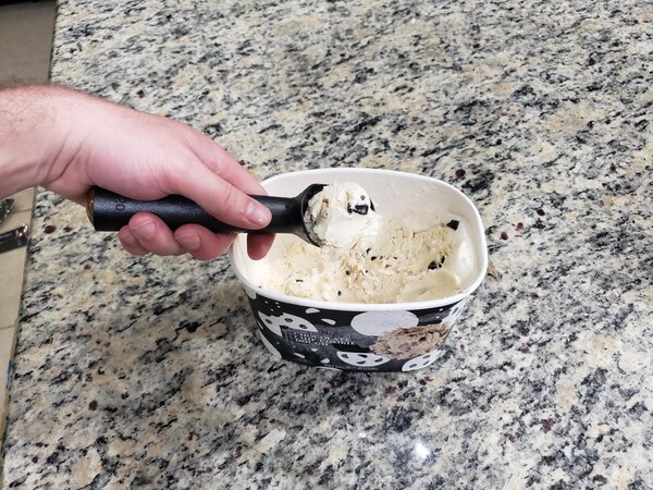 "Great large ice cream scoop. Both the non stick coating and the heat transferring handle makes scooping ice cream a breeze. Great for also scooping cookie dough"