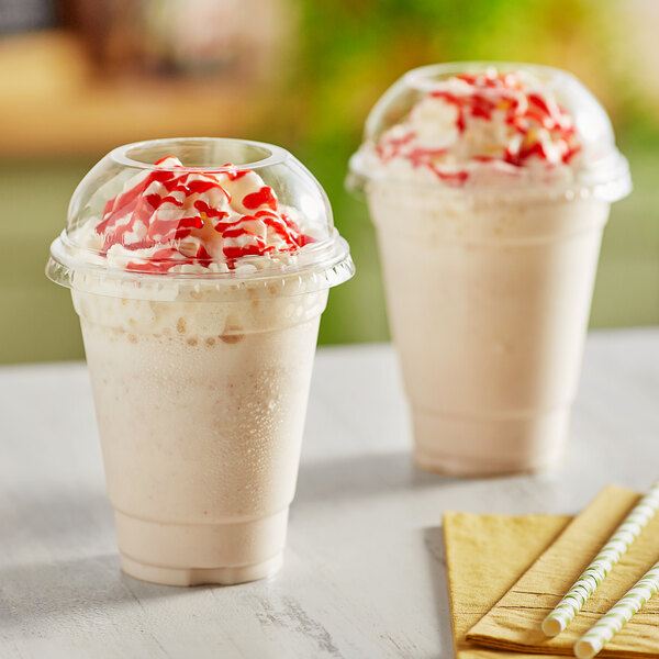 The included lid features a convenient dome shape that creates a greater capacity for a wide variety of beverages from iced coffees to sweet drinks with whipped toppings. The clear lid creates a tight seal, keeping contents fresh and preventing spills and leaks. Its 2" hole accommodates a variety of spoons or straws for easy sipping.