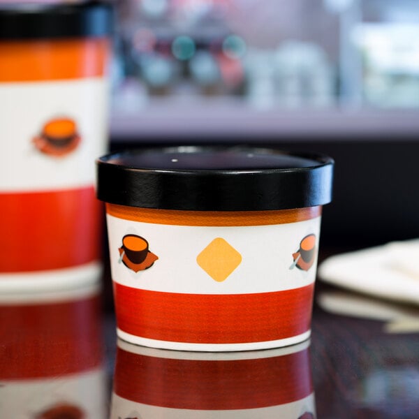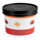 Perfect for delis, markets, or salad bars, this colorful orange and white Choice 12 oz. paper hot food cup and lid combo provides a great presentation for your take-out hot food items!