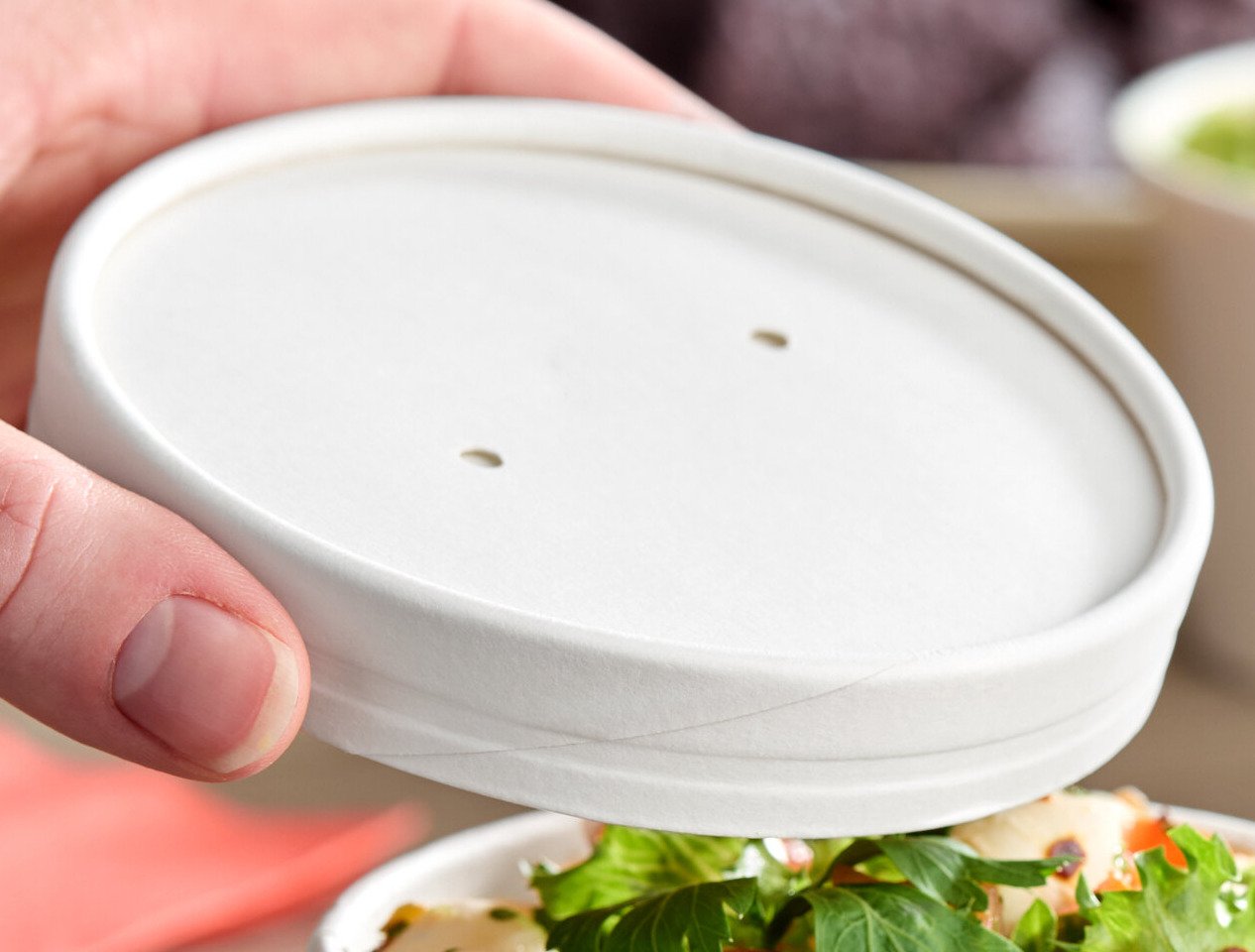 To avoid soggy product, this container and lid combo includes a vented paper lid that lets hot, moist air out, before it becomes stuck within the container. It is a crisp, white color, for a clean presentation every time, and it's made of the same double poly-coated paperboard as the container, so you know it's both durable and moisture resistant.