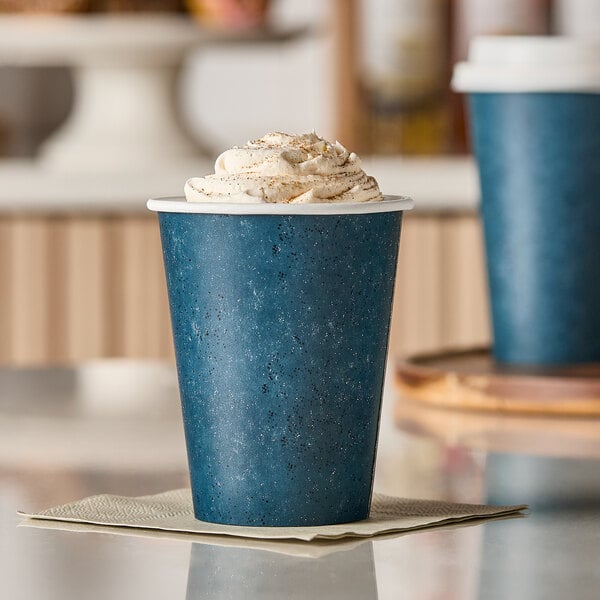 Both versatile and economical, this Choice hot coffee cup is the perfect beverage solution for your cafe, coffee shop, kiosk, concession stand, or convenience store. It features a visually appealing blue speckled design that adds a touch of fun to your drink presentation and has a space-saving construction, allowing it to be placed in a convenient cup dispenser for compact storage and easy accessibility.