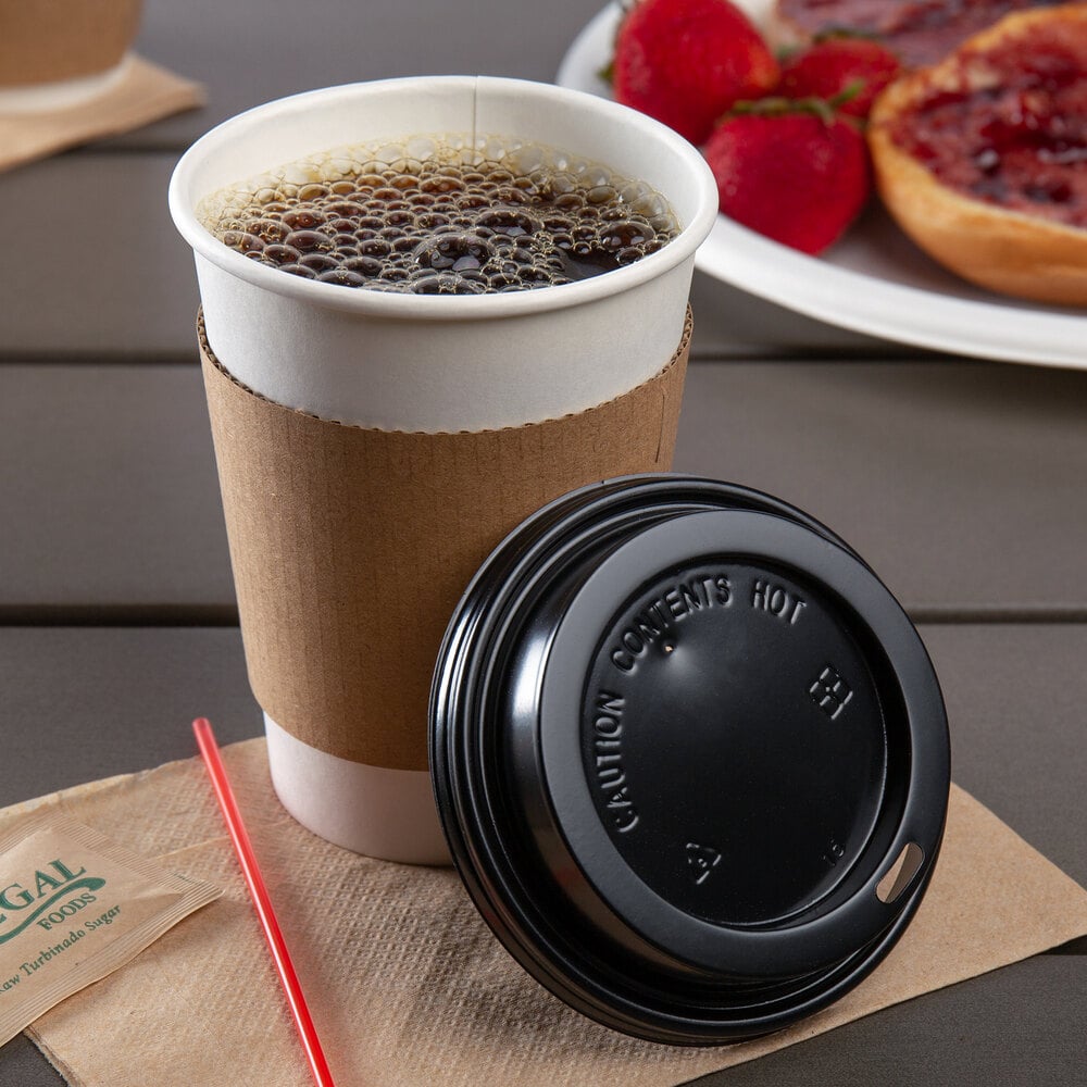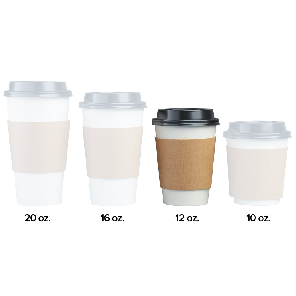 Perfect for any on-the-go foodservice application and also catering, business, church, and school events, this combo kit serves as an all-in-one package for the enjoyment of your favorite hot beverages. A total of (50) 12 oz. paper hot cups are included, as well as 50 matching travel lids and sleeves to allow for efficient, organized service that arranges these three beverage essentials into one convenient kit. By pairing these cups with the right-sized lids in advance, you eliminate the potential for lid/cup compatibility confusion, ensuring your employees and guests can routinely get their hot beverage fix in efficient, organized fashion.
