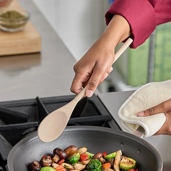 The broad and oval concave bowl simplifies mixing, stirring, and tossing ingredients during food preparation, while the smooth edges and sanded surface ensure a quality product for your kitchen's use. Try the Choice 12" wooden spoon to add elegance and efficiency to your food prep process!