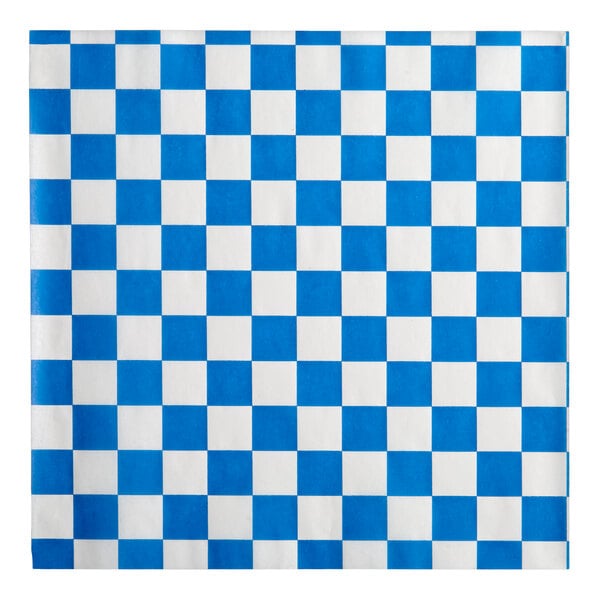 Give your take out snacks or combo platters an attention-grabbing kick of color with this Choice 12" x 12" blue check deli sandwich wrap paper.