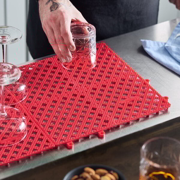 Perfect for lining shelves and counters, this Choice 12'' x 12'' red interlocking bar mat is a great addition to your bar, cafe, restaurant, or pub!
