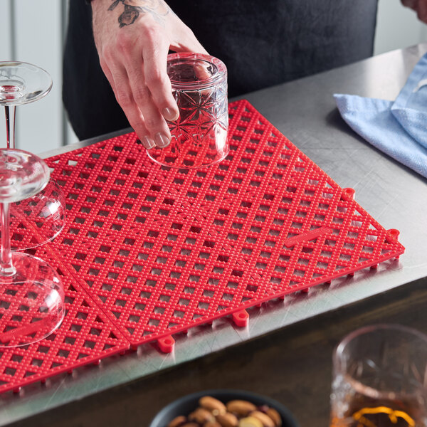 Perfect for lining shelves and counters, this Choice 12'' x 12'' red interlocking bar mat is a great addition to your bar, cafe, restaurant, or pub! Made of non-skid thermoplastic rubber, this durable bar mat ensures your glassware and china stay in place while being stored on counters or shelves. The mat works to decrease potential chipping of your drinkware and reduce the amount of accidental breakage in the fast-paced environment of your busy venue.