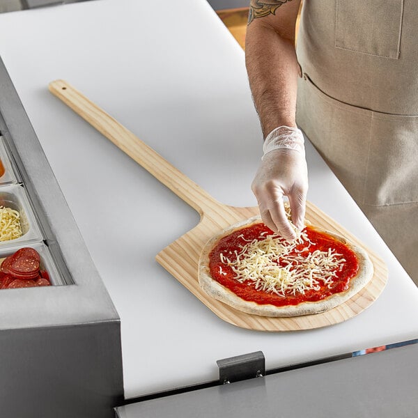 Made out of sturdy pinewood, this wooden peel is superior to your typical steel peels in that it easily slides beneath pizzas and is perfect for tossing pizzas toward the back of the oven without causing damage to the pies. The tapered edge adds to the convenience of this peel ensuring that transporting pizzas from prep table to oven and oven to serving pan is easy and hassle-free! When launching pizzas into your oven, we recommend sprinkling a light dusting of flour or cornmeal over the peel to prevent the dough from sticking to your peel for a seamless transition.