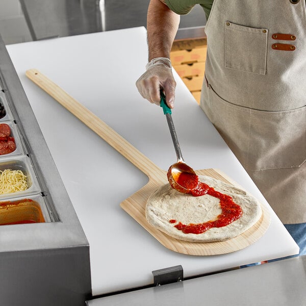 Made out of sturdy pinewood, this wooden peel is superior to your typical steel peels in that it easily slides beneath pizzas and is perfect for tossing pizzas toward the back of the oven without causing damage to the pies. The tapered edge adds to the convenience of this peel ensuring that transporting pizzas from prep table to oven and oven to serving pan is easy and hassle-free! When launching pizzas into your oven, we recommend sprinkling a light dusting of flour or cornmeal over the peel to prevent the dough from sticking to your peel for a seamless transition.