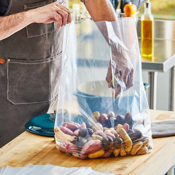 The high clarity of this bag makes it easy to identify the contents quickly. Whether you need to package heavy produce such as oranges or potatoes, shellfish, meat, or heavy dry ingredients including grains and flour, a secure closure can be created using a twist tie or tape. Plus, it can even be heat sealed for added security! This extra heavy-duty plastic food bag is perfect for a variety of commercial applications, including restaurants, delis, and food storage facilities.