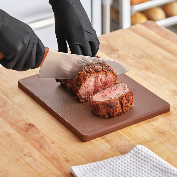 The board's brown design helps you build a color-coded system that complies with HACCP standards, eliminating cross-contamination and keeping your establishment sanitary. This brown cutting board is intended for cutting cooked meats at your restaurant, cafe, or catering company!