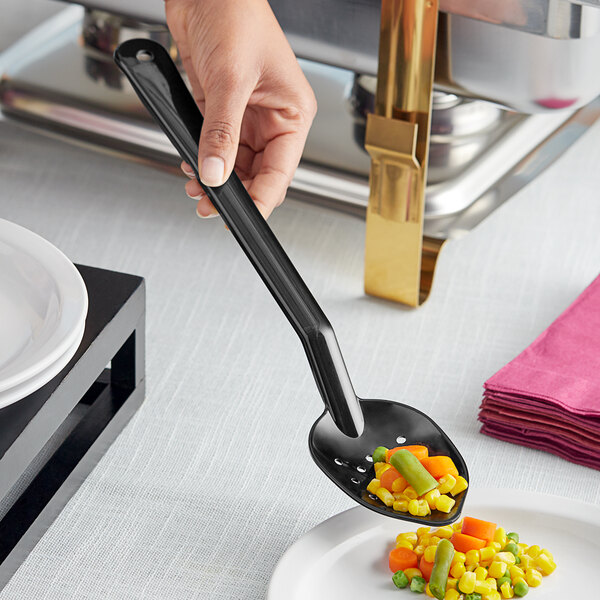 Enhance your serving experience with the Choice 13" black polycarbonate 1.5 oz. perforated salad bar / buffet spoon!