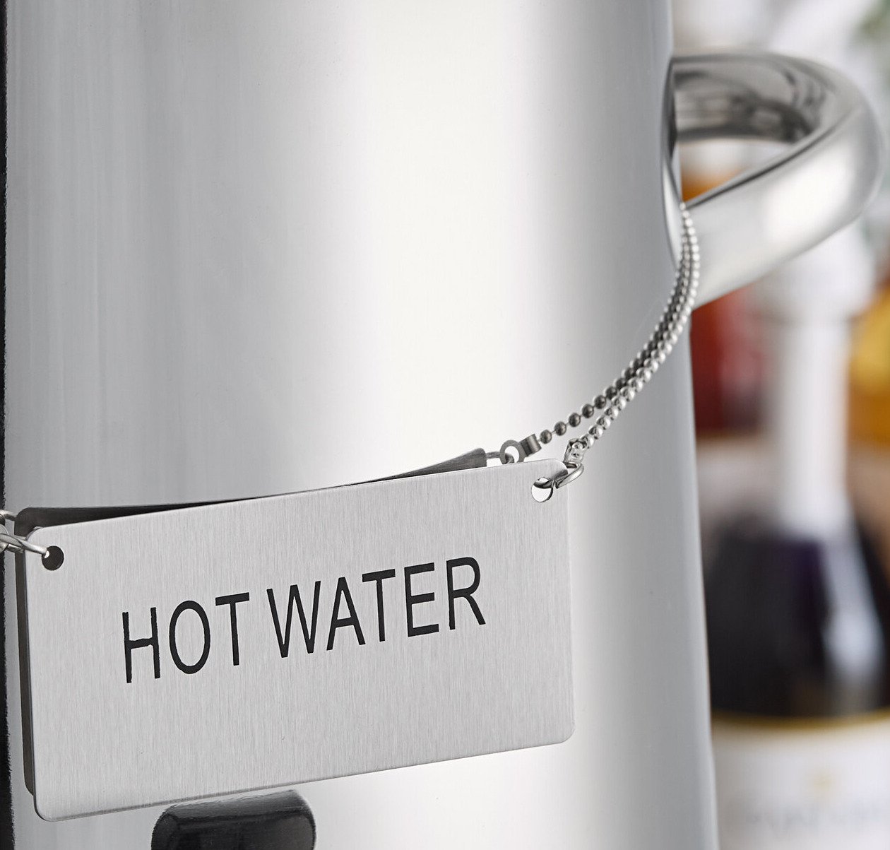 This front-facing urn chain sign has "Hot Water" engraved in easy-to-read lettering to help your guests quickly identify the beverage of their choice! The stainless steel construction provides a sleek look to your counter.
