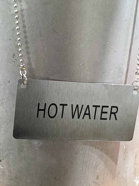 This front-facing urn chain sign has "Hot Water" engraved in easy-to-read lettering to help your guests quickly identify the beverage of their choice! The stainless steel construction provides a sleek look to your counter.