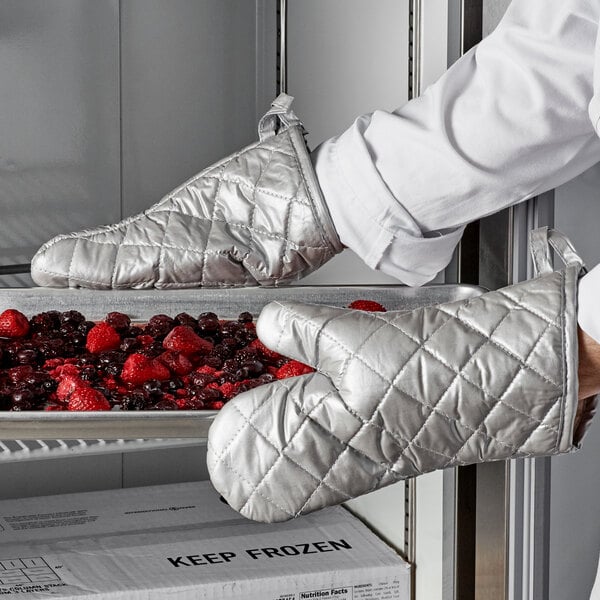 Designed to keep your kitchen staff safe from accidental burns or injuries, these oven mitts provide protection from exposure to an oven's high temperatures and also to a freezer's cold temperatures. Use these versatile mitts to handle culinary creations like freshly baked pies, cooked casseroles, and steamed vegetables, or frozen boxes of ingredients, meats, and prepared meals, all with incredible ease!