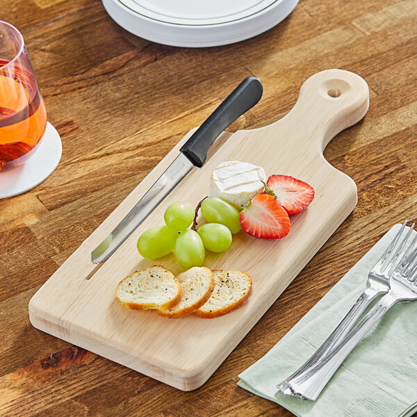 This Choice 13" x 5 1/2" x 3/4" small wooden bread cutting board with knife slot and handle is perfect for serving fresh baked bread, charcuterie, and hors d'oeuvres in an unexpected manner. Use it at your restaurant, bar, cafe, or bistro. It's great for setting up table or buffet displays at catered events, or for unique front-of-the-house displays.