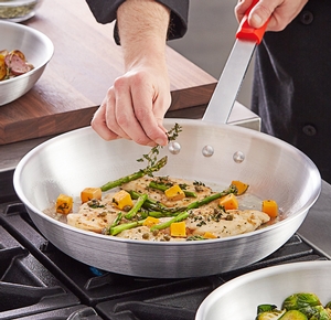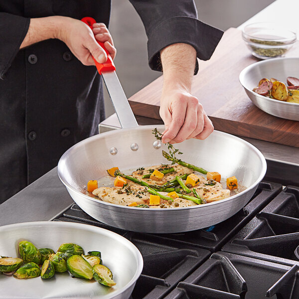 Ideal for making low acidic foods such as mushrooms, broccoli, and cauliflower, this item features gently sloped sides that are perfect for turning, flipping, and removing delicious vegetable medleys from your pan. Its aluminum construction is also built for dependable use yet provides your kitchen with a lightweight, economical option that won't break the budget. Its red silicone handle even offers a comfortable grip that's heat-resistant up to 450 degrees Fahrenheit!