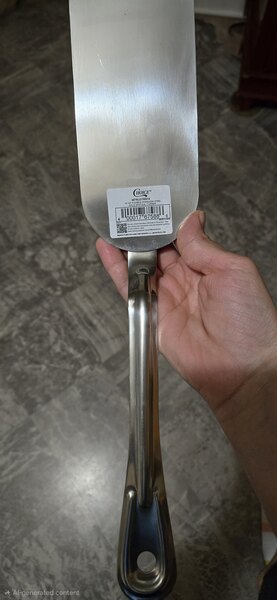Flexible yet sturdy. Ideal for open pans and surfaces because it is longer than a traditional spatula. It works for pans too but a smaller pans it wont lay flat in. One thing I didnt like was that handle was welded to the head and i thought i was getting a one piece stainless steel turner. But it still works i just hope the welding is strong enough. Overall nice lightweight spatula and very useful.