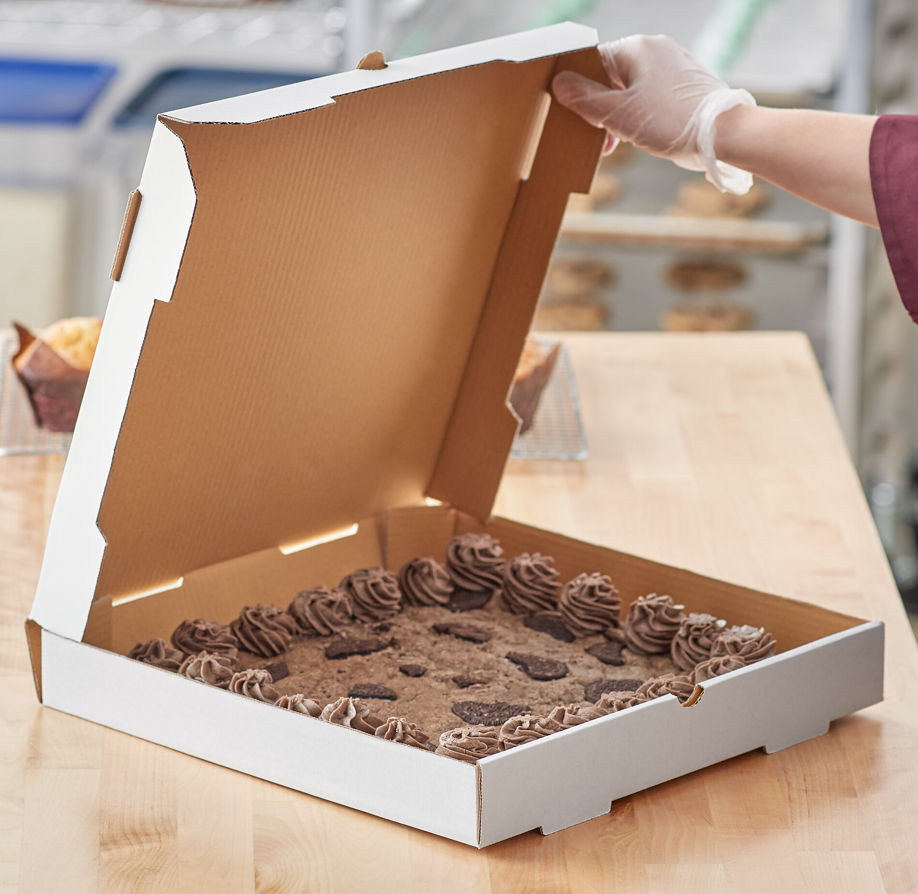 This plain 14" x 14" box is constructed of durable B flute corrugated cardboard, like most standard pizza boxes. Use as a bakery box to package giant iced cookies or cakes for your customers' birthday celebrations or other occasions.