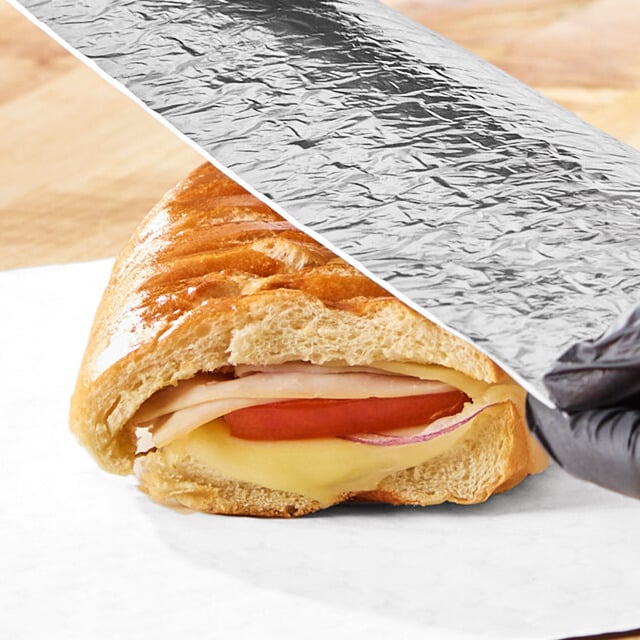 Featuring a grease-resistant property, these laminated foil sheets will prevent grease leakage and keep your customers' hands clean while maintaining an appetizing appearance on the grab-and-go shelves at your cafeteria or convenience store.