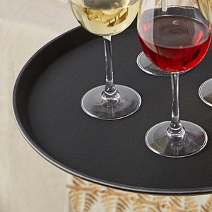 This round serving tray is a good size. It’s non-skid feature is very convenient and it seems to hold up. It is sleek and very attractive.