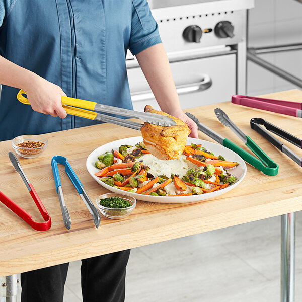 The assorted color handles allow them to be used as part of a HACCP or other color-coded system to help reduce the risk of cross-contamination in your kitchen. Assigning a particular color tongs to a specific application will help prevent the spread of foodborne illnesses and create a more organized workflow for your staff.