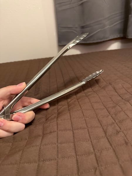 The sleek appearance of the stainless steel makes these tongs great for front-of-house serving as well as back-of-house use. The 16" length works great for grilling, allowing you to keep a safe distance away from the grill while maintaining enough control to flip, move, and twist comfortably. The two-piece design allows the tongs to be locked into place together, saving space and ensuring they can be stored easily in drawers or bins. Whether used for serving or cooking, these tongs are bound to satisfy!