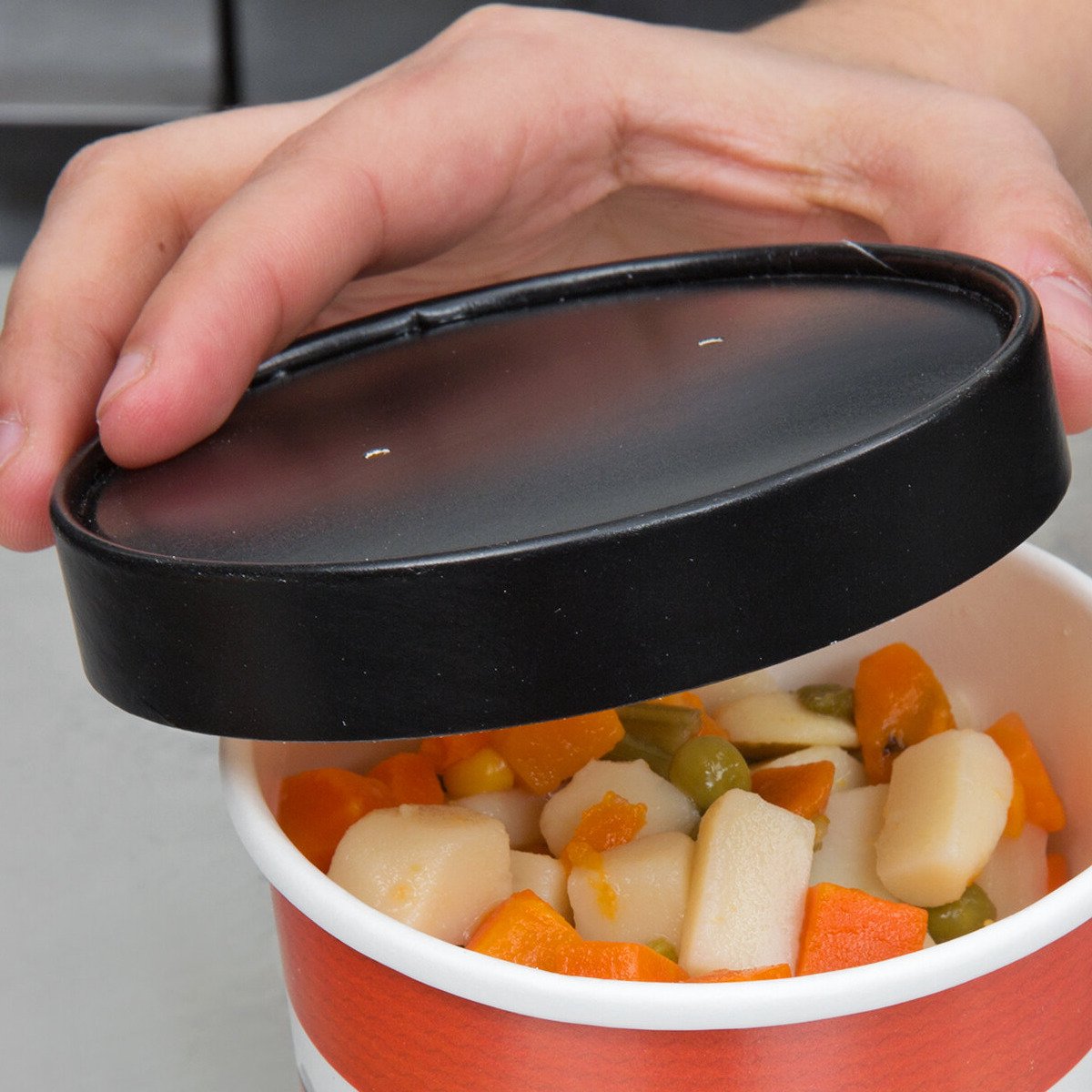 Notice ...the tops of these containers do not seal. They easily come off spilling the contents in the customers packaging. Cup holds hot foods well, its the tops that do not snap or firmly seal.......lots of customer complaints.