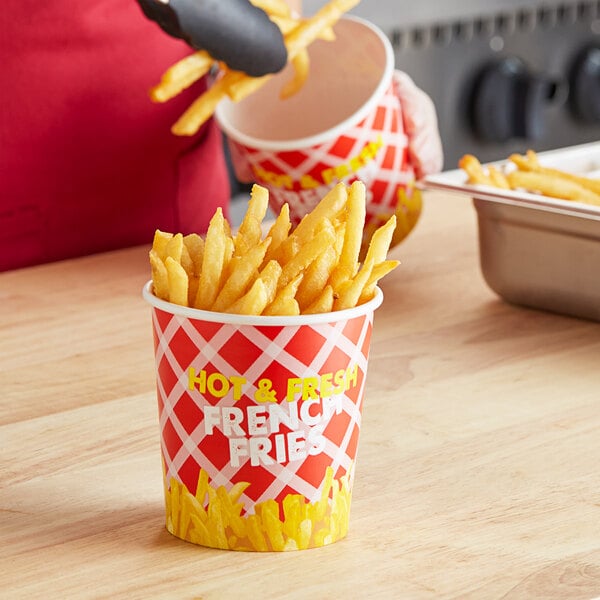 With its classic round shape and 16 oz. capacity, this Choice french fry cup makes an excellent addition to your fast food restaurant or stadium. Featuring a bold red background with eye-catching french fry graphics, this cup is a great way to display and serve your popular fries. For compact storage and quick retrieval, simply stack multiple cups!
