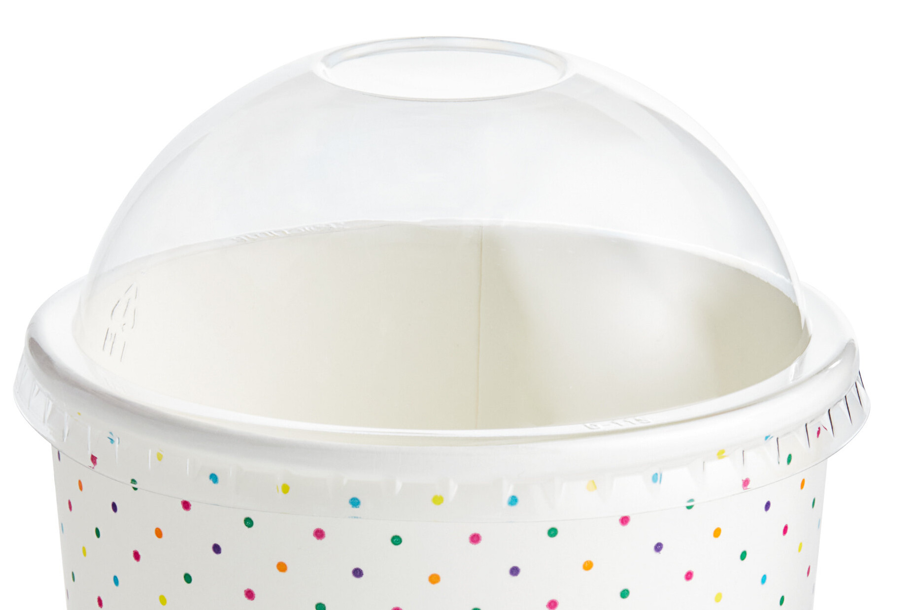 Use this versatile cup and lid to serve ice cream, frozen yogurt, or mixed fruit. Plus, its domed design provides the extra room necessary for adding whipped cream or any number of ice cream toppings. For added convenience, this cup and lid are also disposable for easy and quick cleanup. This cup with lid is also perfect for serving hot foods! Serve your guests small soups or even side dishes like mashed potatoes and macaroni and cheese.
