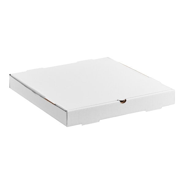 Made of 100% recycled, B-flute cardboard, this 16" x 16" high-quality white corrugated plain box prevents grease and moisture from seeping through, making it perfect for packaging freshly-made pizzas, calzones, and strombolis. It ships flat to maximize storage space and can easily be assembled by folding along perforated edges and locking the ends into place.