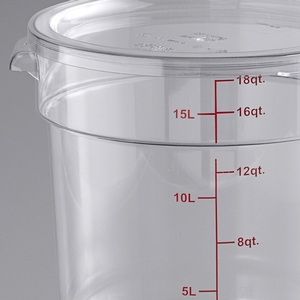 The crystal-clear design takes the guess work out of trying to identify what food product is stored inside. Bold red graduations are printed on the side of the container in both quarts and liters for easy, immediate measuring. This food storage container's round shape means it maximizes airflow in and around the product. Easily identify and track the date your food product was made using the reusable "date" indicator at the bottom of the container or simply adhere a label to the side of your container.