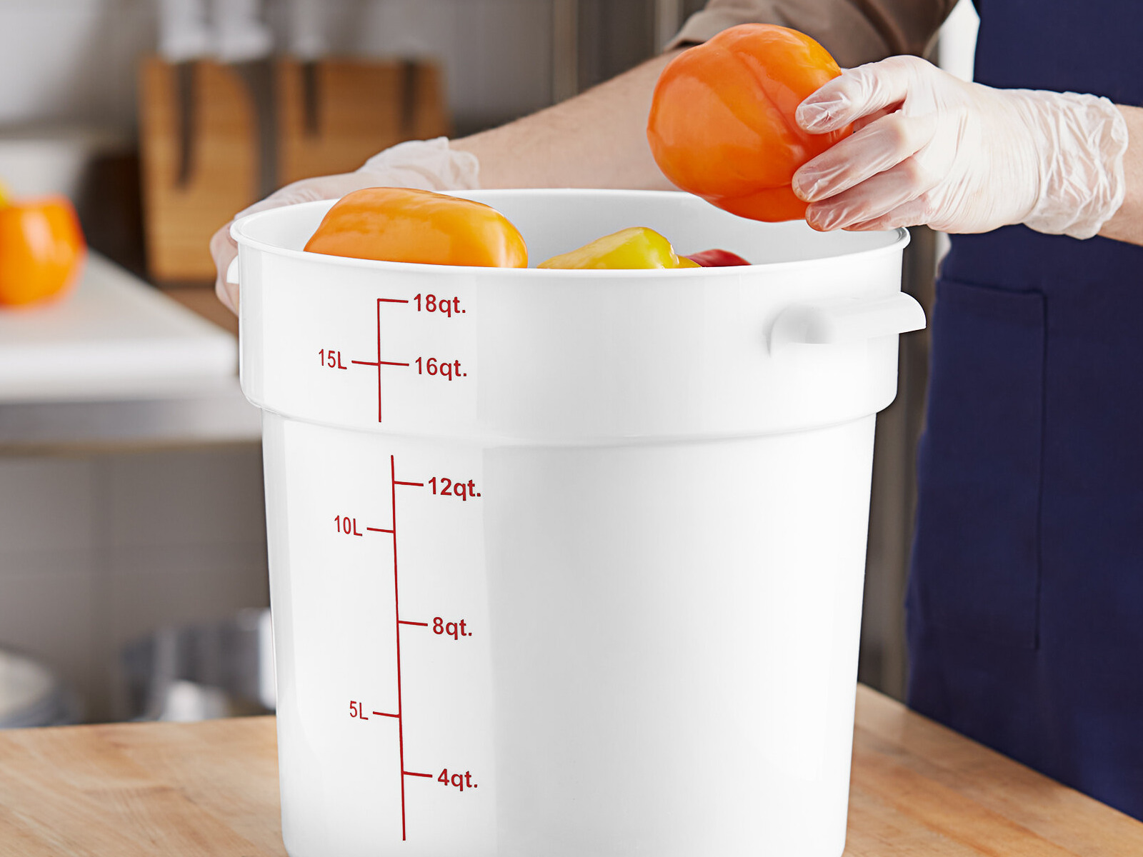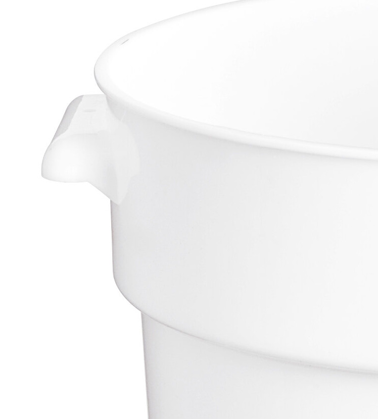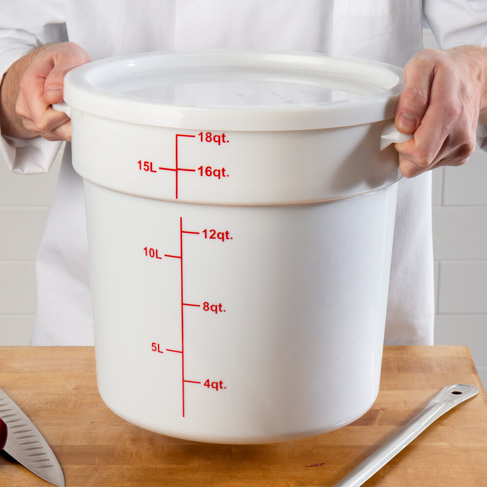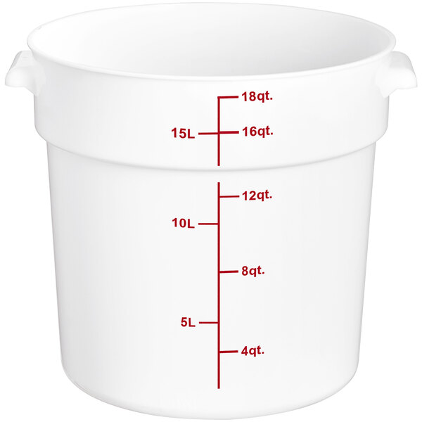 This 22 qt container is perfect for storing ingredients. Its round design and red gradations make measuring easy. Durable and easy to clean.
